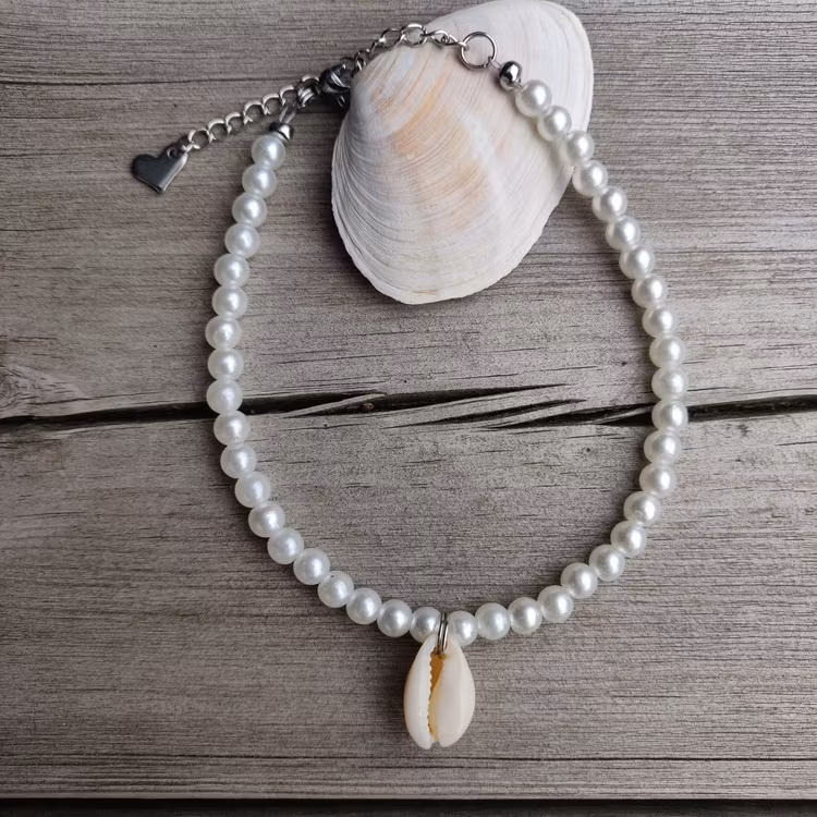 Fotlänk i rostfritt stål med snäcka och cremevita akrylpärlor. Reglerbar från ca. 20 till 25 cm