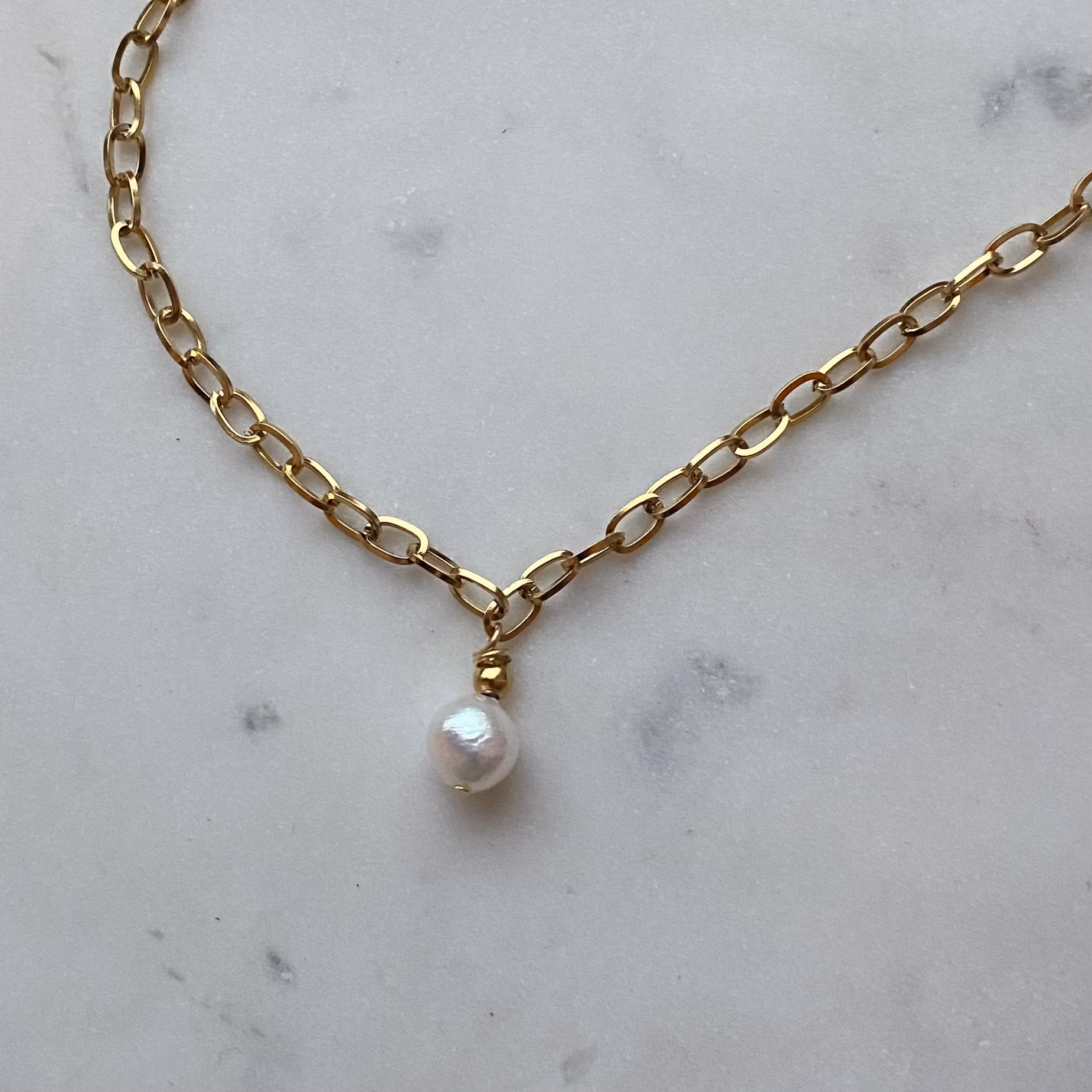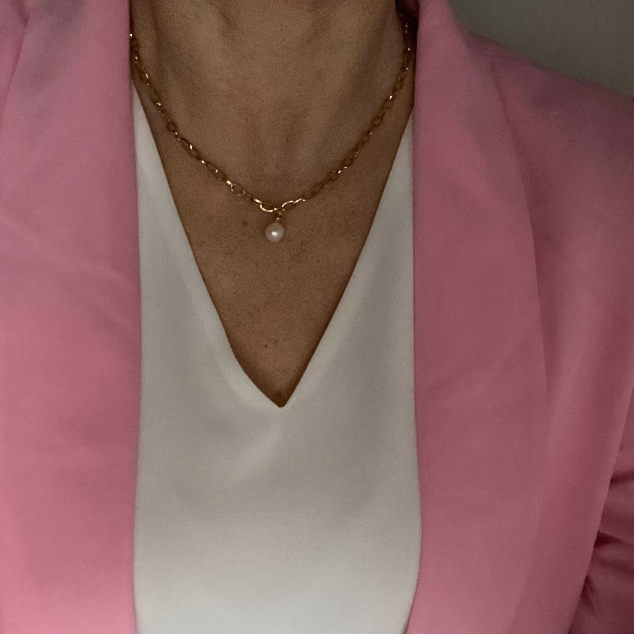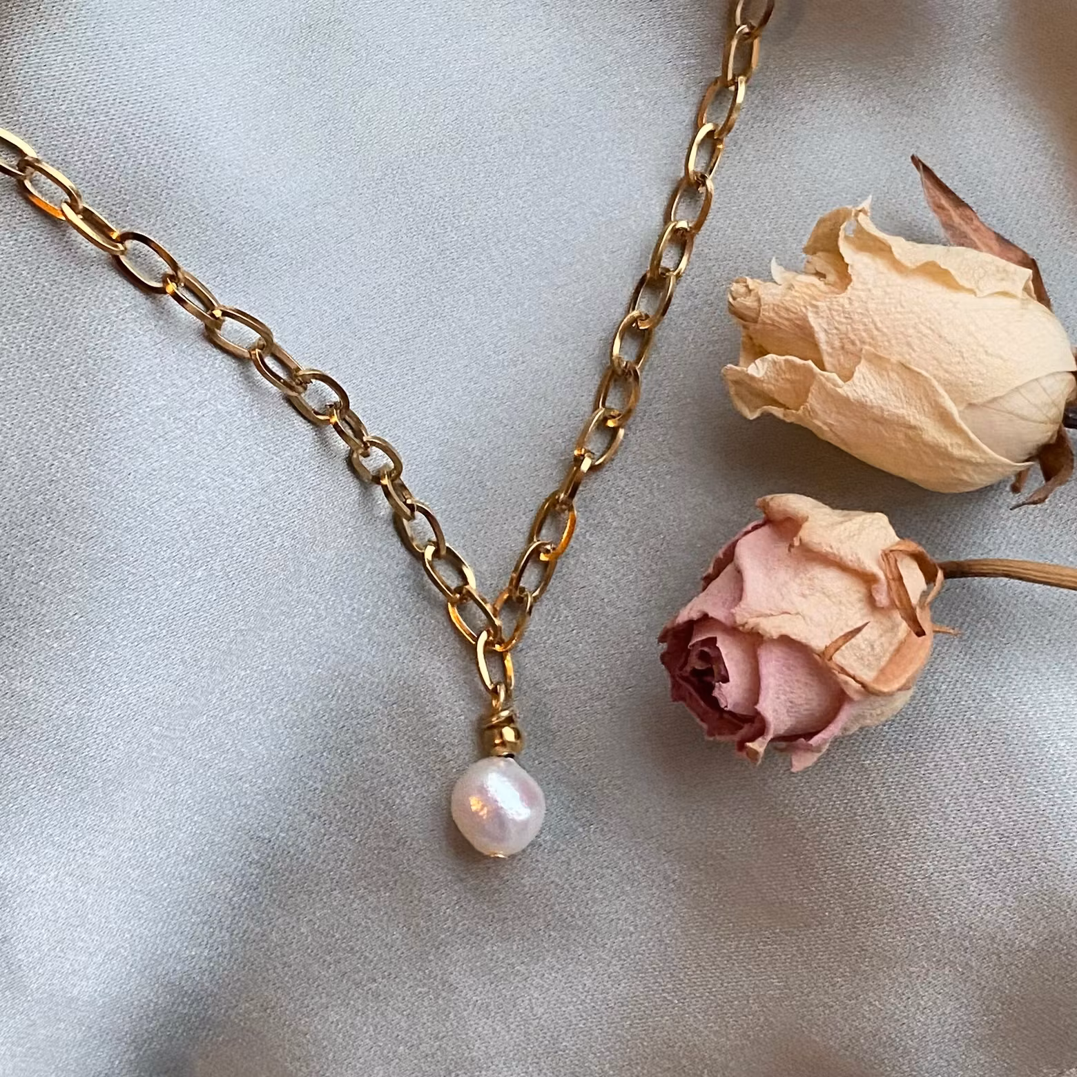 Halsband i guldfärgat rostfritt stål med unik sötvattenspärla. Nickelsäkert.
