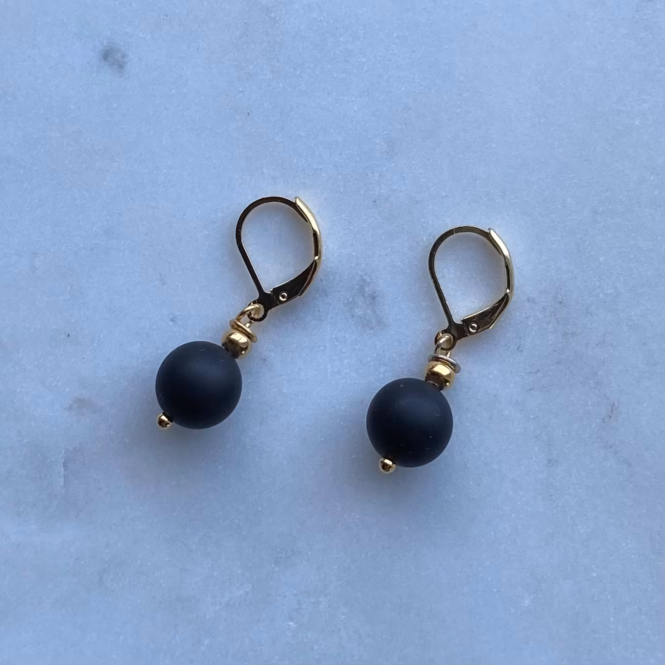 Brisyrörhängen i guldfärgat rostfritt stål med matta svarta agater. Nickelsäkert.