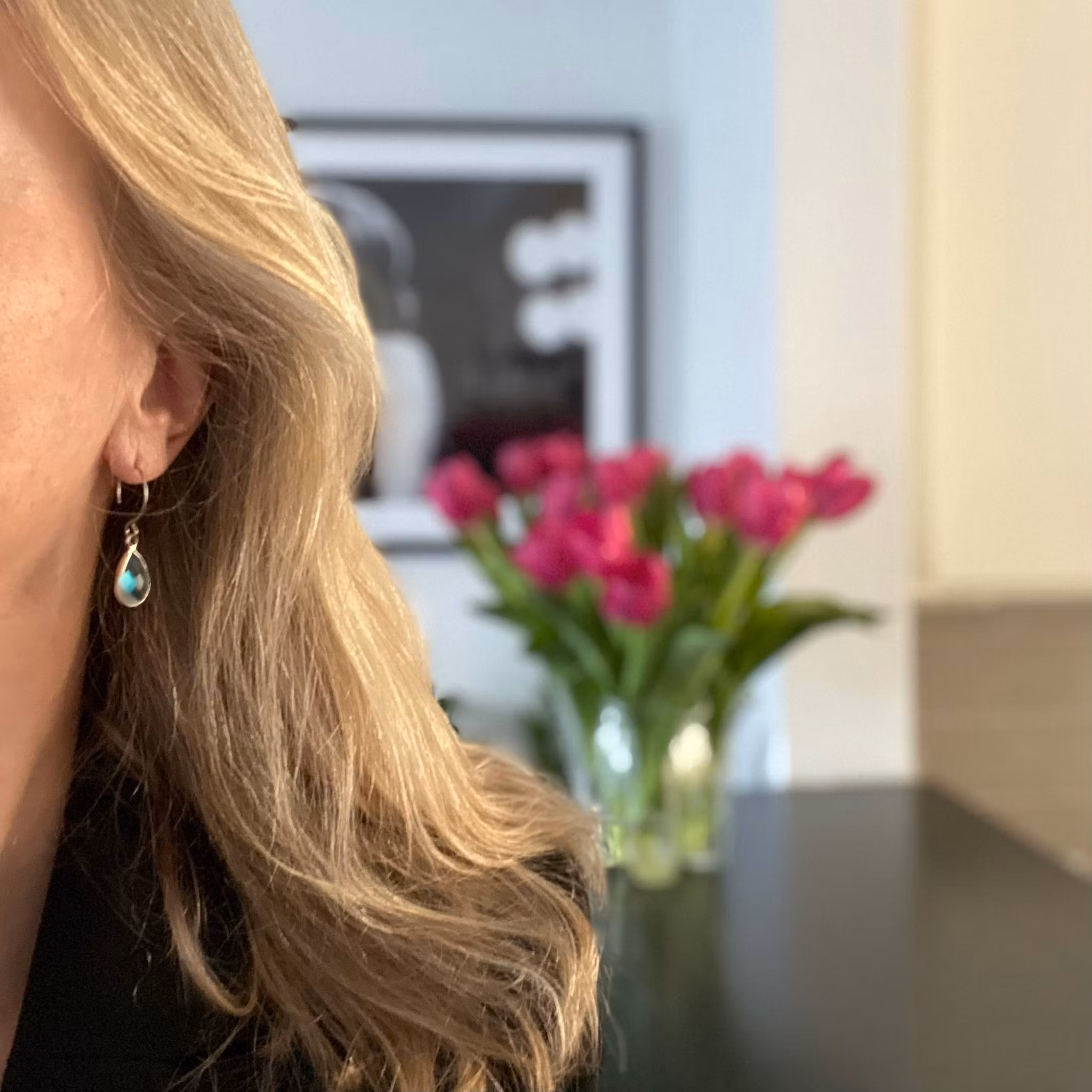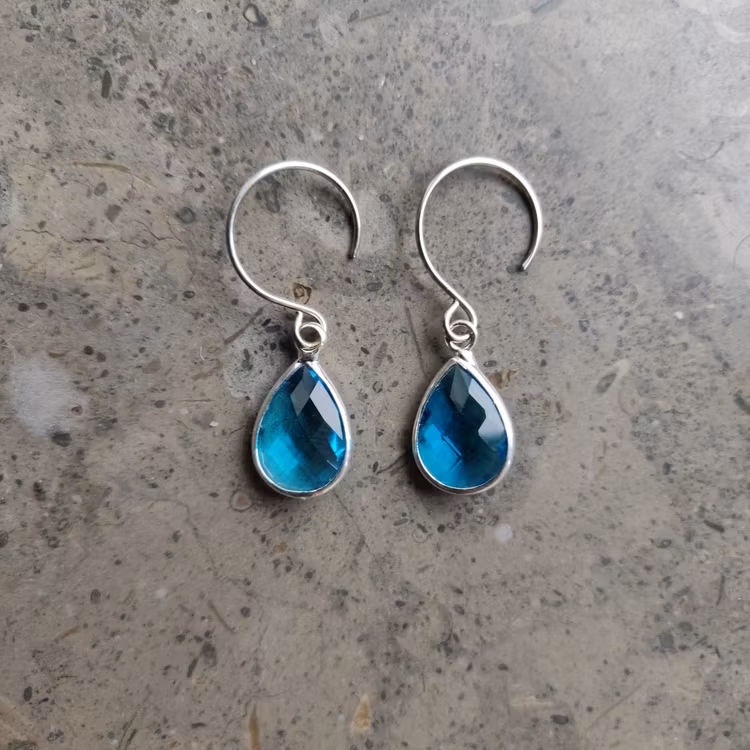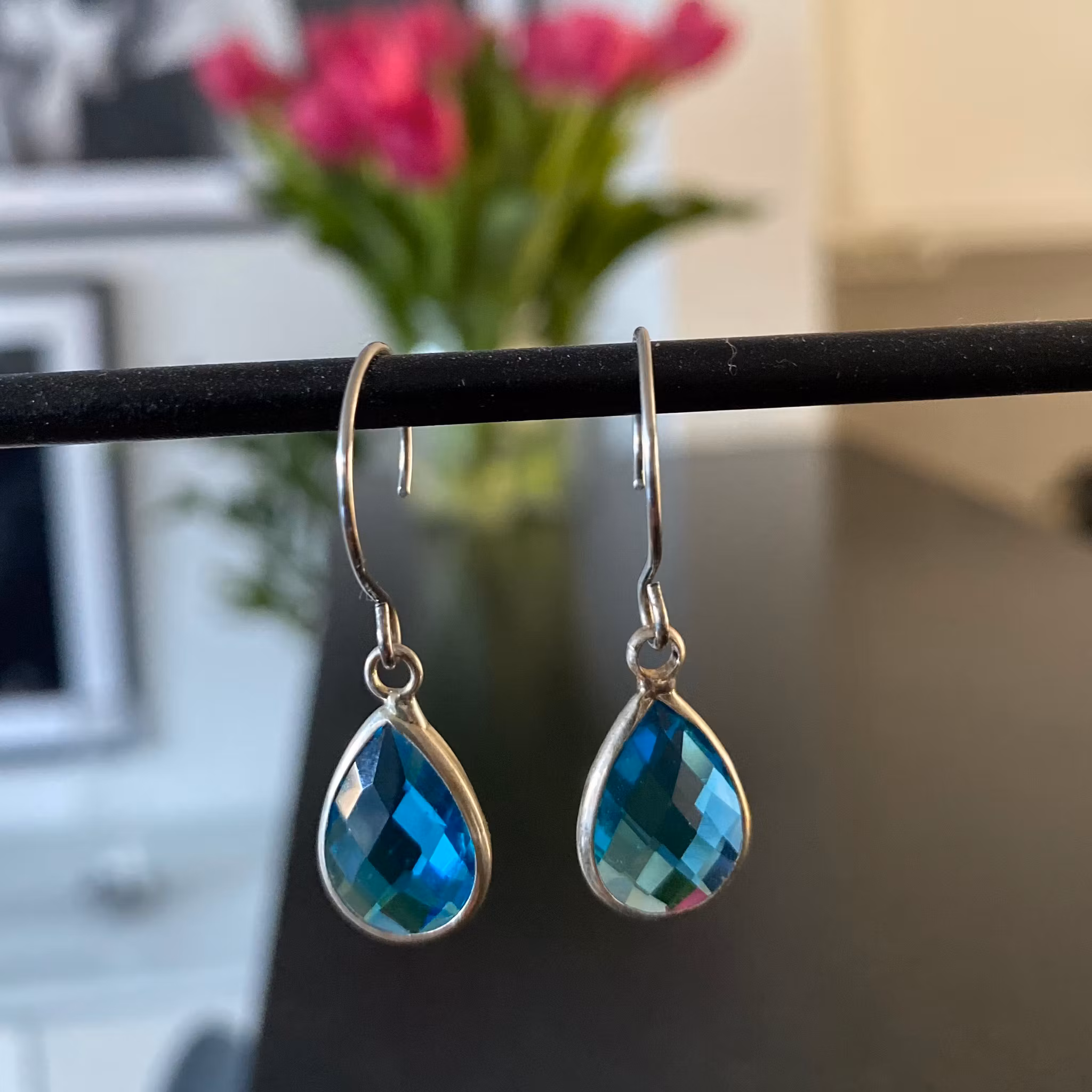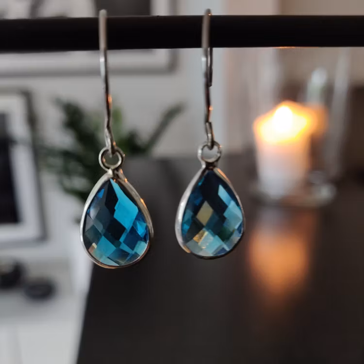 Örkrokar i rostfritt stål som är ca. 18.5x14 mm med turkosa glasdroppar. Nickelsäkert