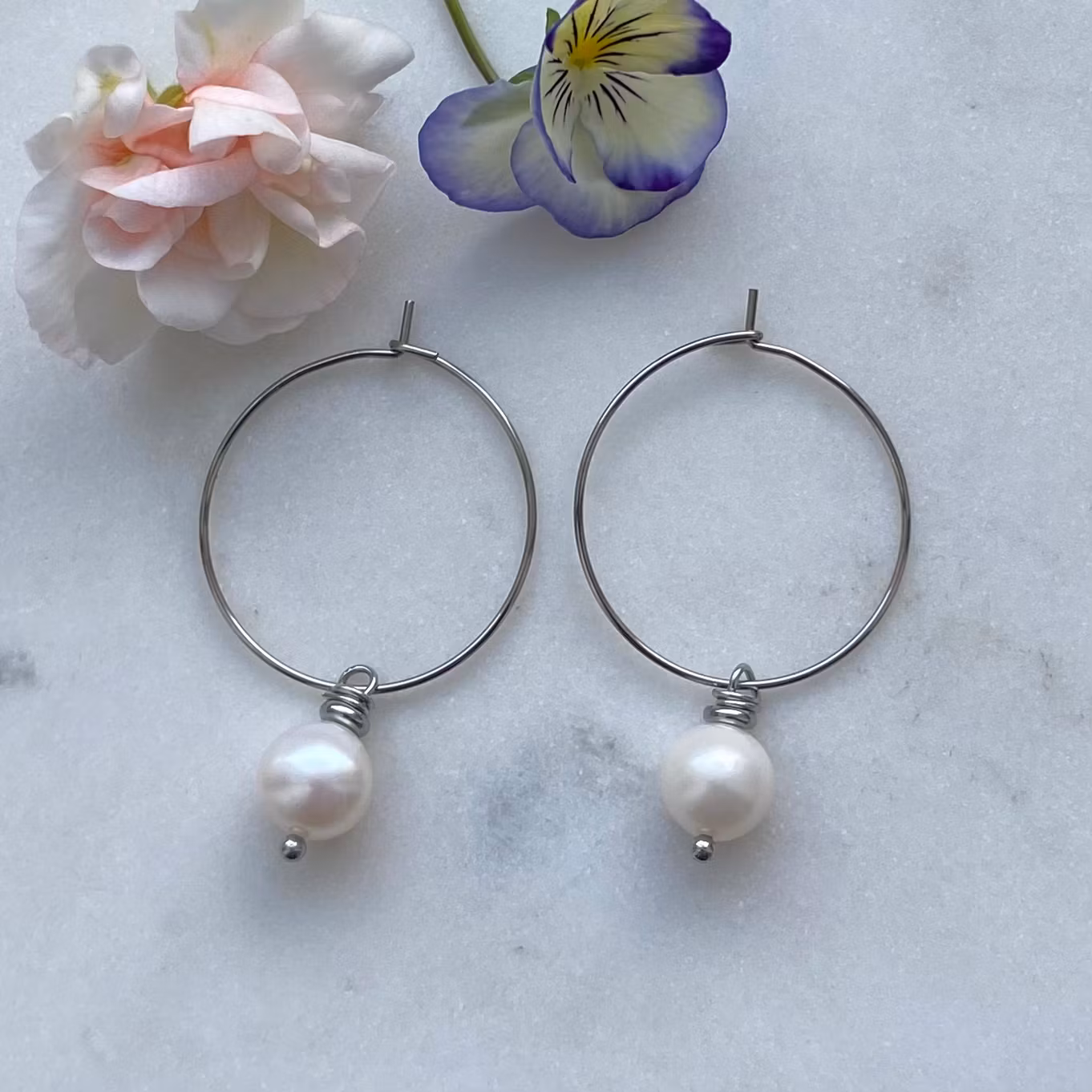 Creolörhängen i rostfritt stål med sötvattenspärlor. Pärlorna är skapade av naturen och varje pärla är unik. Nickelsäkert.