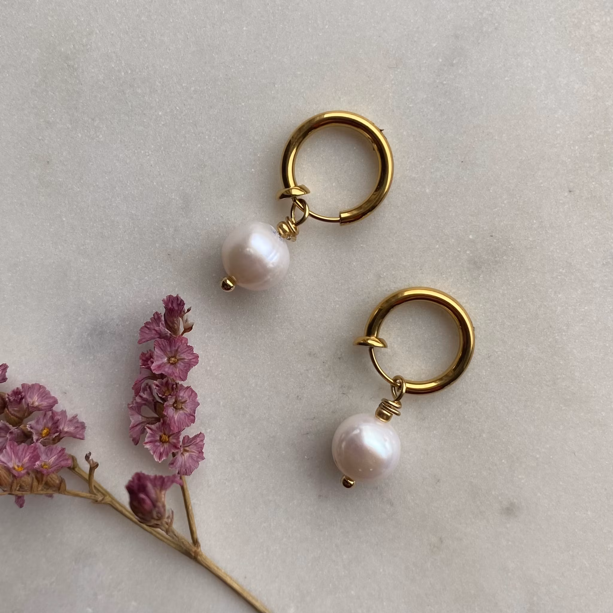 Creolörhängen i guldfärgat rostfritt stål med oregelbundna sötvattenspärlor. Passar även dig utan hål. Nickelsäkert