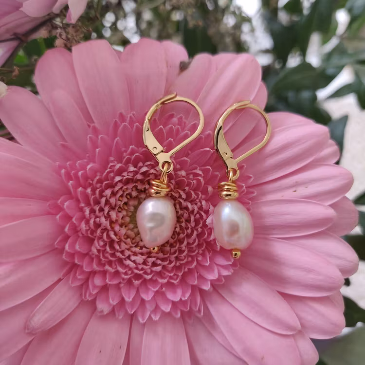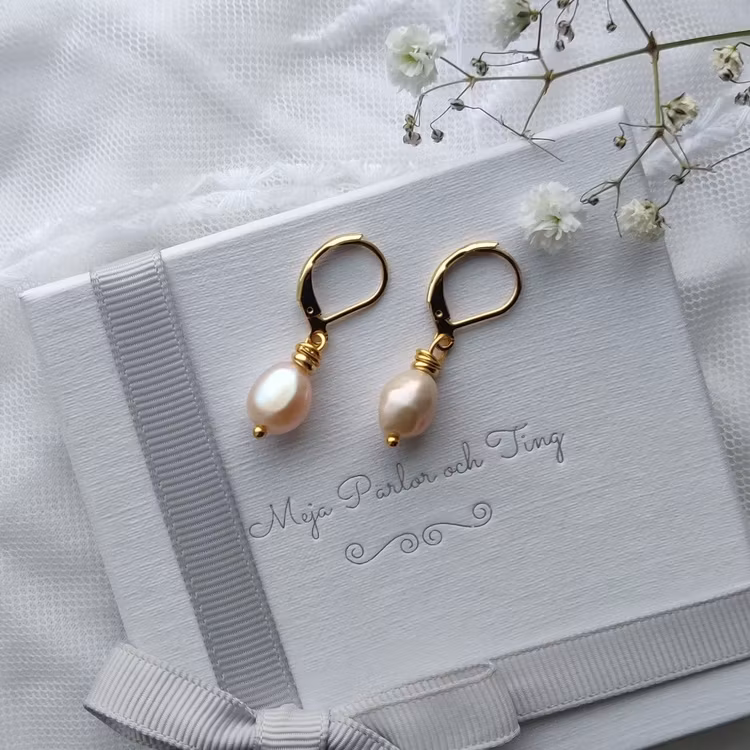 Brisyrer och detaljer i guldfärgat rostfritt stål med sötvattenspärlor i oregelbunden form. Varje pärla är unik i både färg och form. Färgen är persika, en mild naturlig aprikos färg.