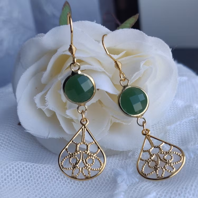 Örkrokar, detaljer och lätta droppar i guldfärgat rostfritt stål med gröna länkar i metall. Nickelsäkert. Hänget är ca. 35 mm