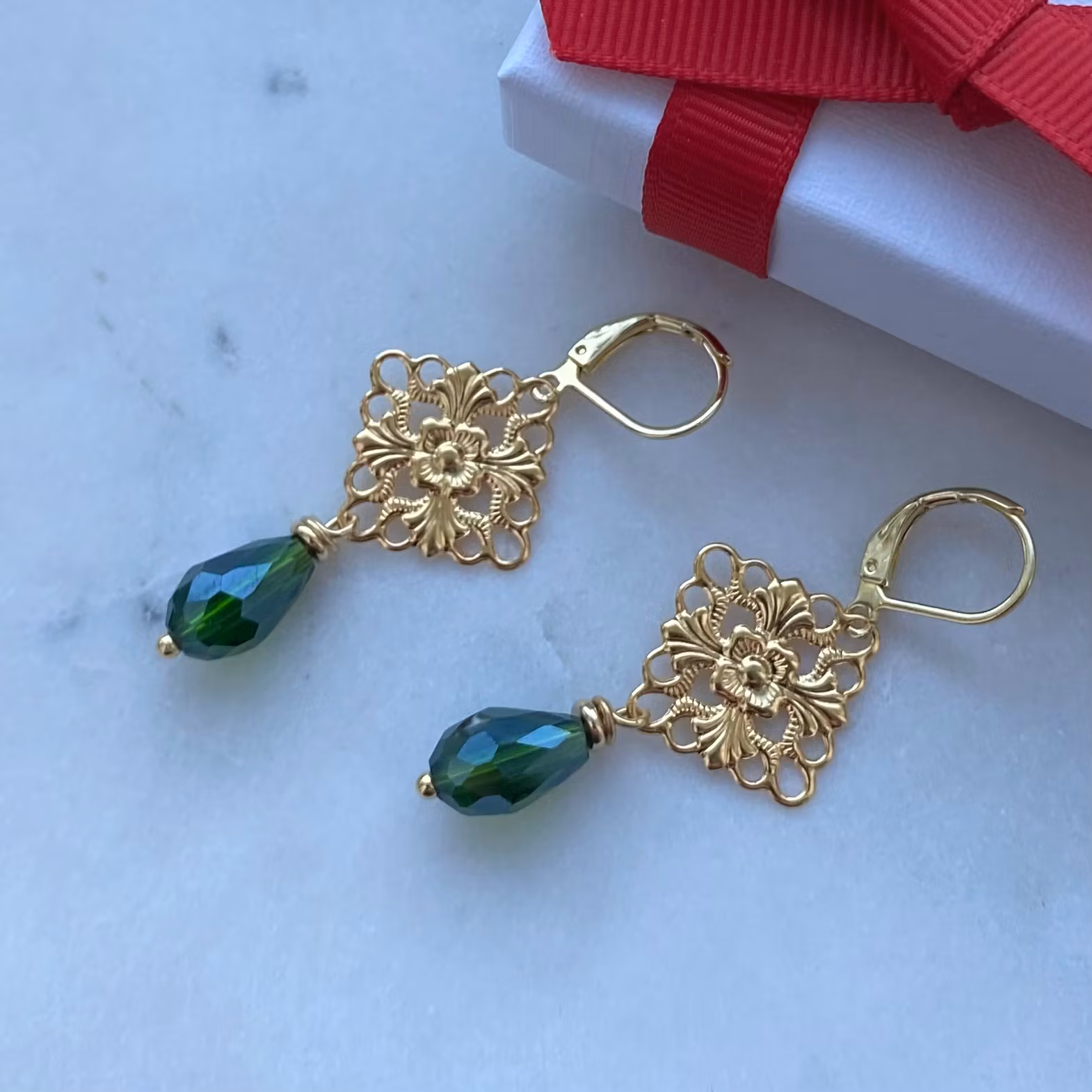 Brisyrörhängen i guldfärgat rostfritt stål med länkar i tunn metall och droppar i grönt. Nickelsäkert
