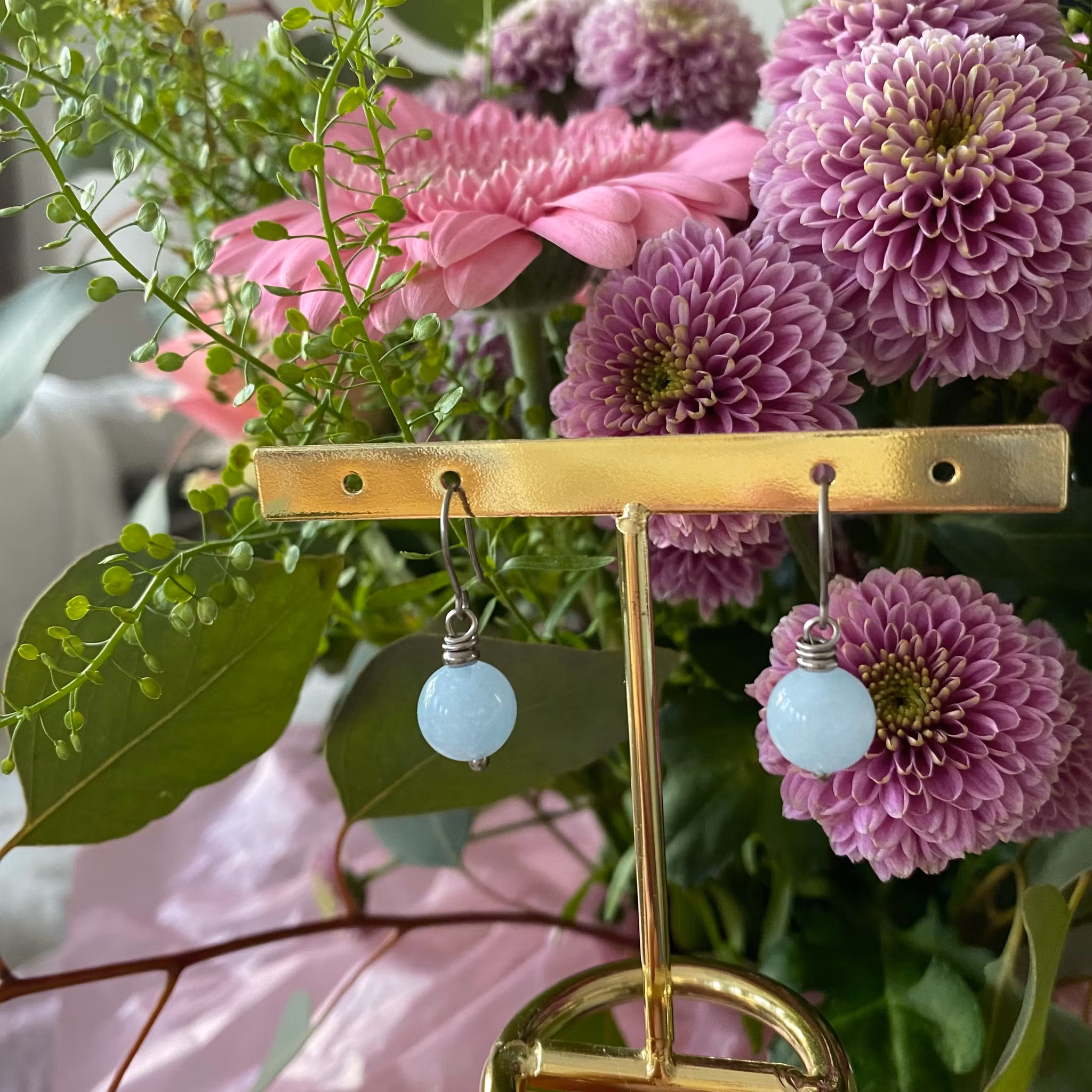 Örkrokar i titan med ljusblå pärlor. Övriga delar är i rostfritt stål. Nickelsäkert.