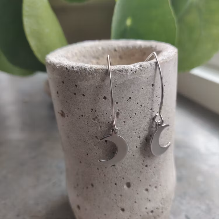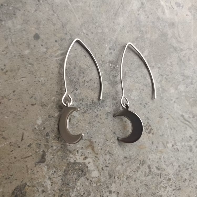 Långa örkrokar och månar i rostfritt stål. Örkroken är ca. 26 mm och månen är 16x11x0.9 mm