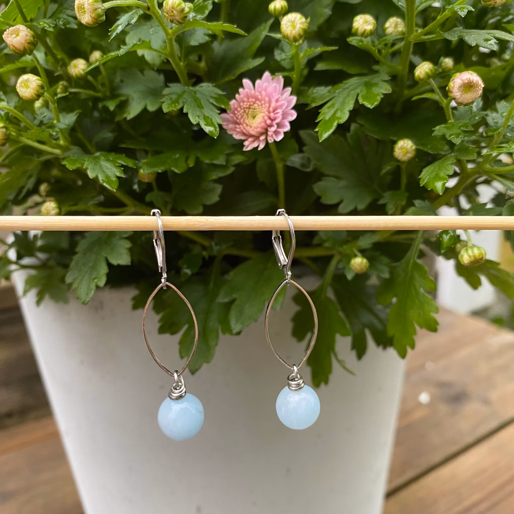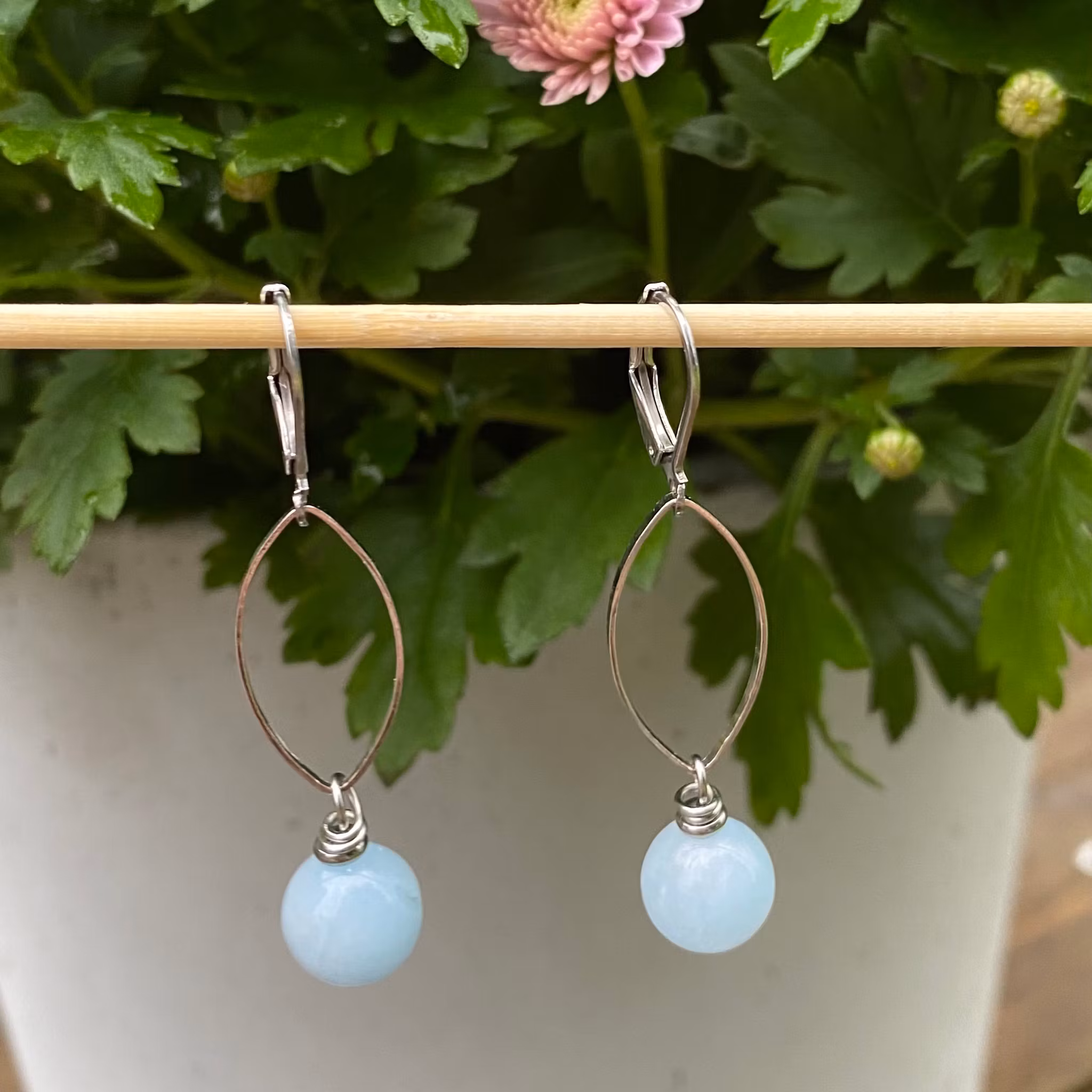 Örkrokar i rostfritt stål med hängen av återbruk och ljusblå pärlor. Nickelsäkert