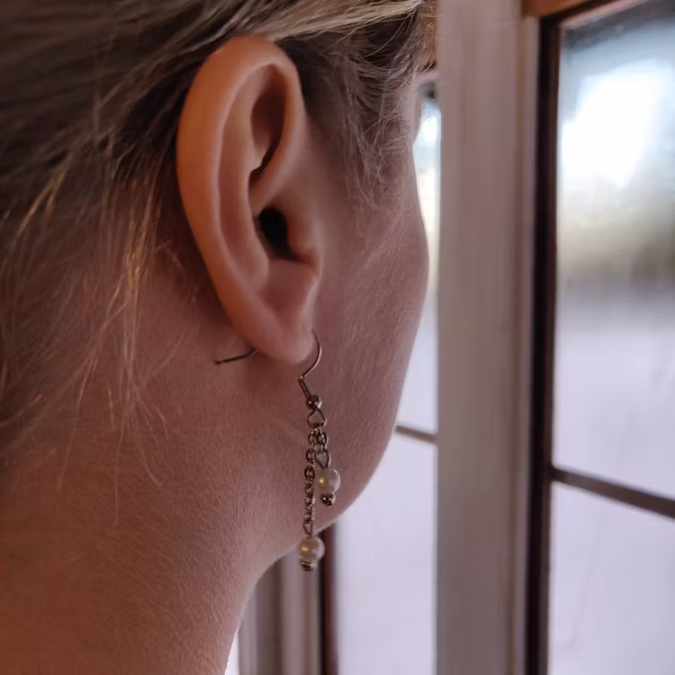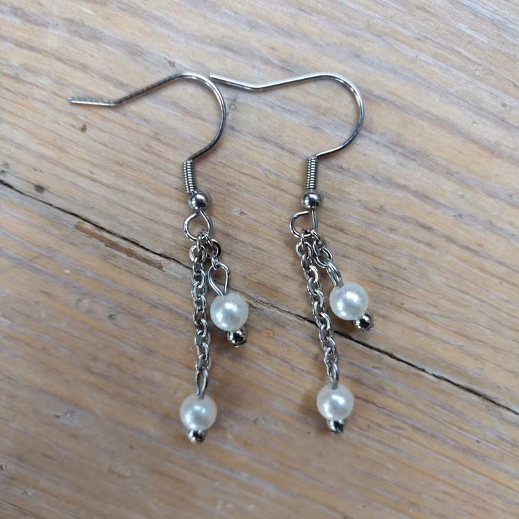 Örkrokar, hängen och små pärlor i rostfritt stål samt cremevita akrylpärlor. Nickelsäkert