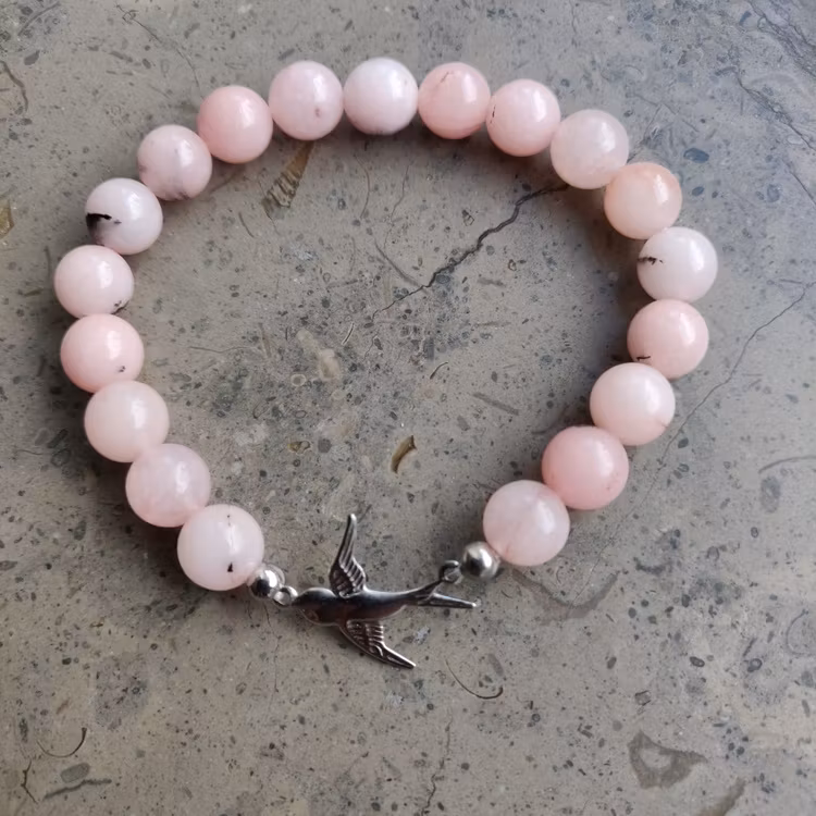 Jasper körsbärsblom 8 mm med en svala i rostfritt stål. Armbandet är ca. 18 cm. Meddela i kassan om annat mått önskas