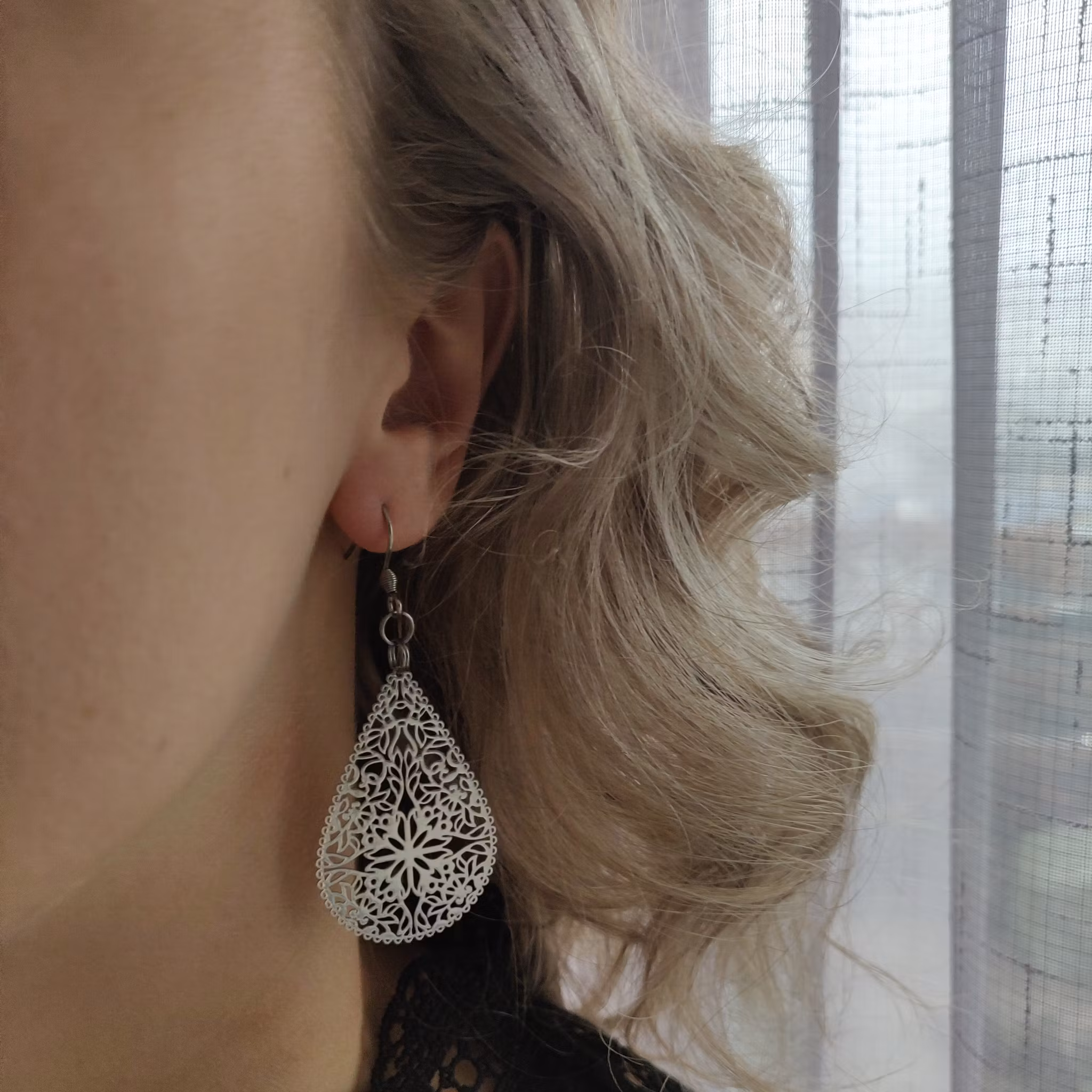 Örkrokar i rostfritt stål med tunna filigranhängen i silvermetall som är ca. 4 cm. Nickelsäkert