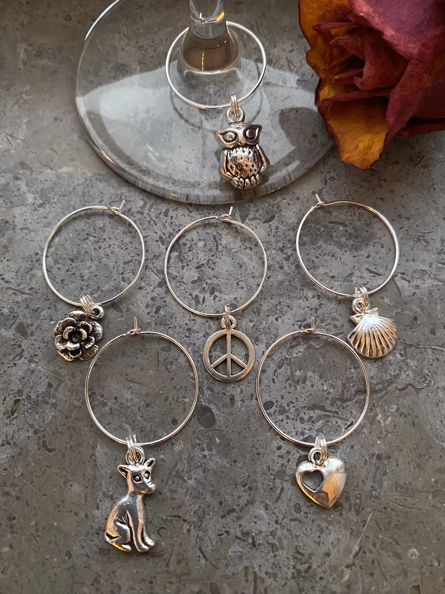 6 vinglasmarkörer med olika figurer. Allt i metall